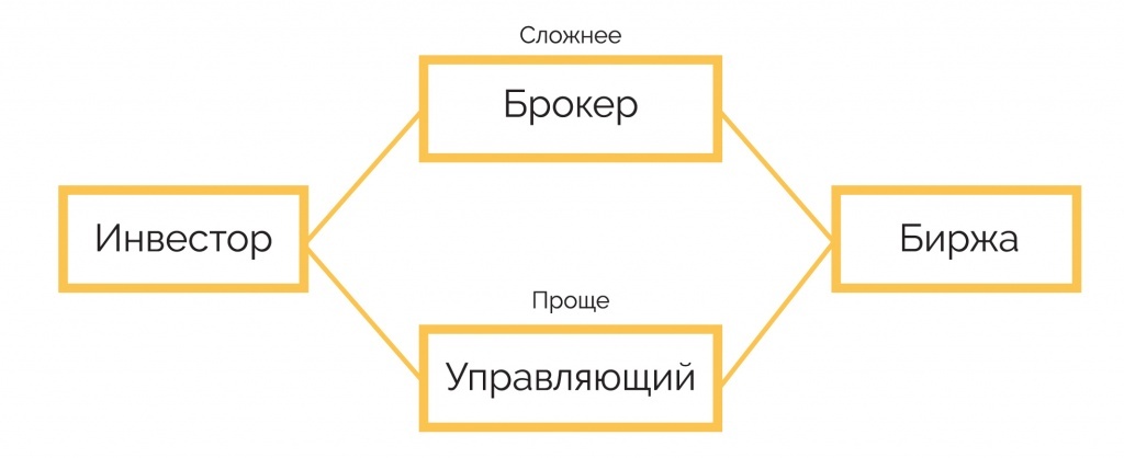 Если вы готовы пройти обучение инвестициям, погрузиться в тему, постоянно мониторить ситуацию на фондовом рынке, можете торговать самостоятельно. Тогда вам понадобится брокер, который станет вашим посредником для доступа к бирже. Вы будете сами принимать решения о покупке и продаже, а брокер — выполнять ваши поручения.